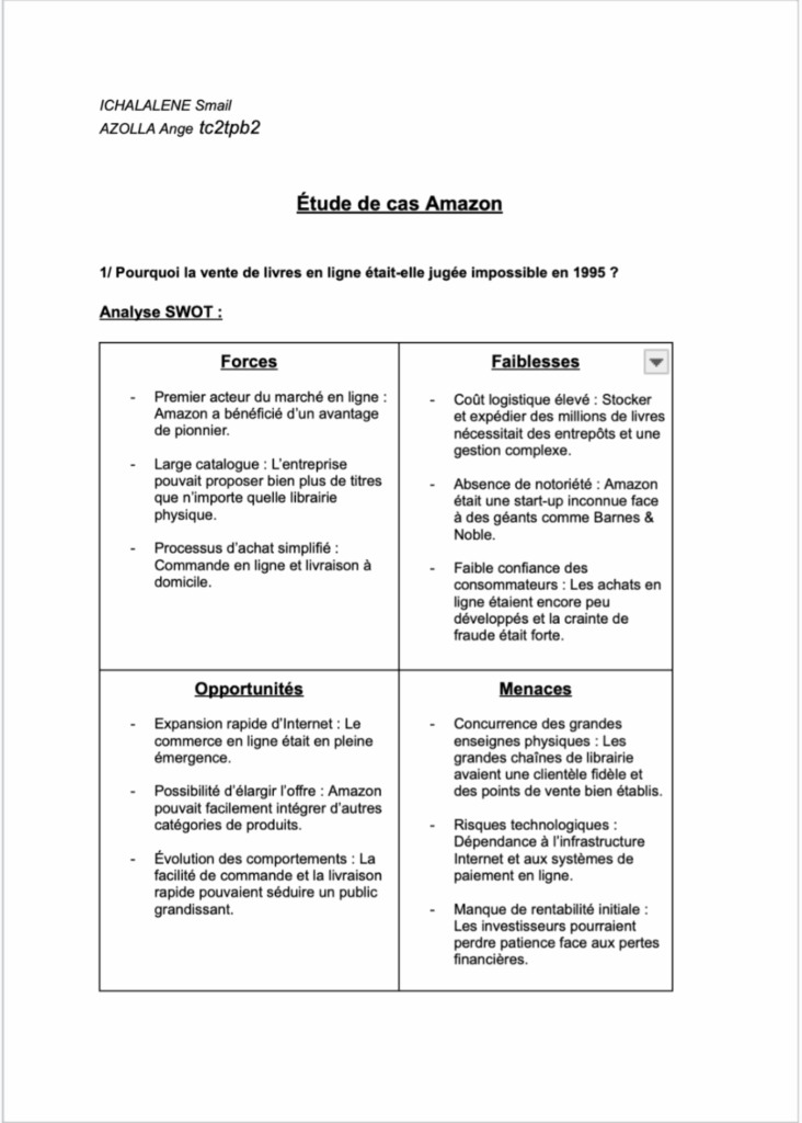 Durant le cours de marketing stratégique, nous avons réalisé une étude de cas sur l’entreprise Amazon. La mission consistait à analyser l’entreprise à travers une méthode SWOT (forces, faiblesses, opportunités, menaces) pour comprendre son positionnement et ses défis. Travail en duo, uniquement un rapport écrit à remettre.