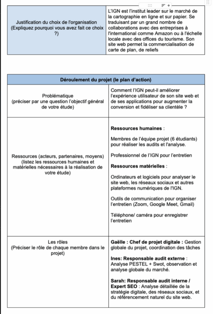 Dans le cadre du cours de marketing digital, nous avons réalisé un audit interne du site web de l’Institut Géographique National (IGN). Le travail s’est fait en groupe de 5 élèves. L’objectif était d’analyser la performance, l’ergonomie, le contenu et la stratégie digitale du site afin de proposer des pistes d’amélioration.