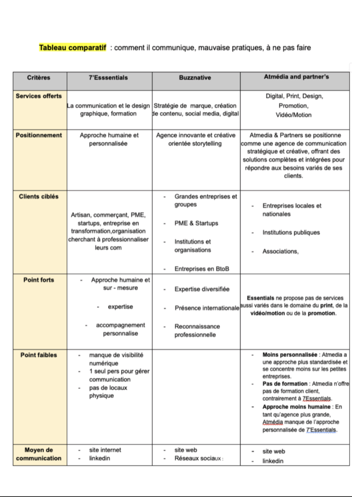 Je considère avoir bien acquis cette compétence car j’ai su construire un tableau complet, pertinent et bien organisé. J’ai pu justifier mes choix d’analyse et mieux appréhender les stratégies de communication des concurrents.