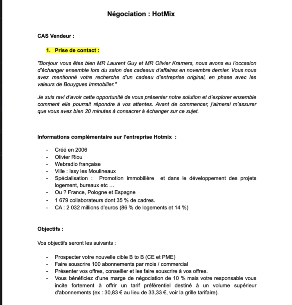 Dans le cadre du cours de vente, nous avons travaillé sur la prise de contact avec l’entreprise Hotmix. Cette activité visait à simuler une première approche commerciale, en préparant les étapes et arguments pour entrer en relation avec un client potentiel. Travail individuel.