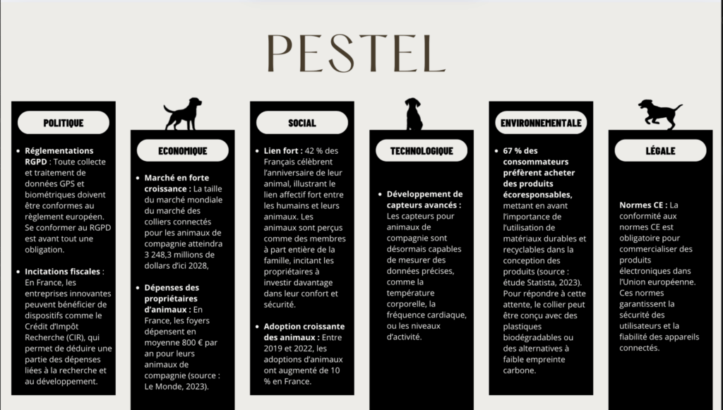 Dans le cadre de la SAE création de site web, nous avons réalisé une analyse PESTEL pour étudier les facteurs externes influençant le marché des colliers électroniques pour chiens. Cette analyse visait à mieux comprendre l’environnement politique, économique, social, technologique, écologique et légal du secteur. Travail en groupe.