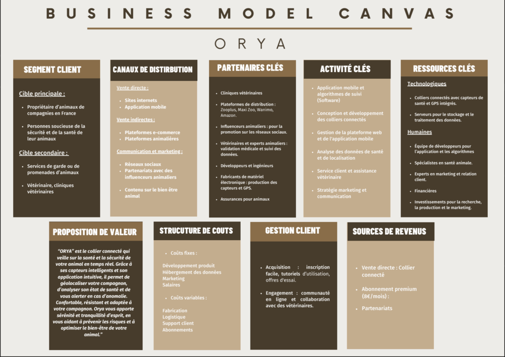 Dans le cadre de la SAE création de site web, nous avons travaillé sur le projet de vente de colliers électroniques pour chiens. Mon rôle a été de réaliser le Business Model Canvas, un outil stratégique qui permet de décrire et structurer le modèle économique du produit. Travail en groupe.