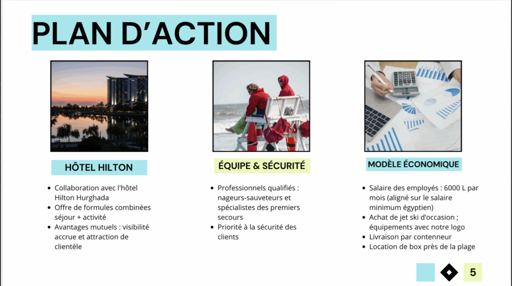 Dans le cadre du cours de projet international, nous avons travaillé en duo pour créer un projet entrepreneurial. Nous avons choisi de lancer une agence de jet ski en Égypte, et notre mission était d’élaborer un plan d’action détaillé pour le développement de cette activité à l’international.