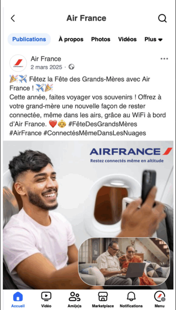 Dans le cadre du cours de marketing digital, nous avons eu pour mission de concevoir des posts destinés aux réseaux sociaux afin de promouvoir l’arrivée de la WiFi à bord des avions Air France. L’objectif était de toucher et engager les internautes via Facebook.