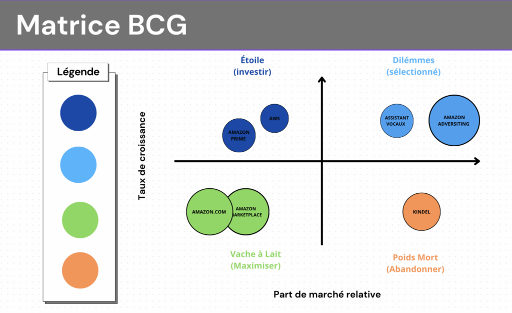 Dans le cadre d’une étude de cas sur Amazon, j’ai dû réaliser une matrice BCG afin d’analyser le portefeuille de produits de l’entreprise. Cet outil permet de classer les produits en fonction de leur part de marché et de la croissance du marché.